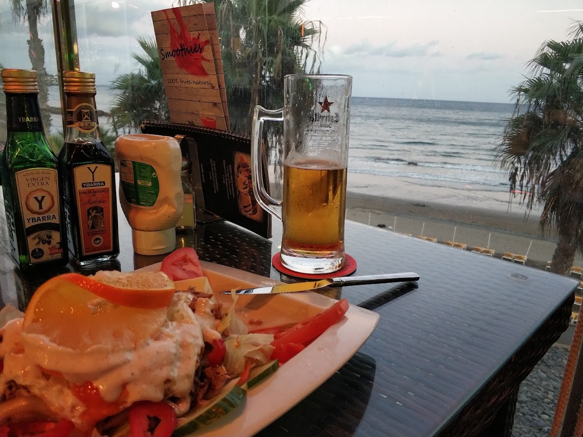 Wow, what a gem! Located on the sea front, you can watch the waves roll in while dining which is exactly what you want while on holiday! Attentive waiting staff who got drinks for us as soon as we sat down. We originally wanted to order a pork dish but after being recommended the Espetada original grill, we decided to give it a go. The meat was succulent & tender and portion size was perfect. We shared this dish and the bacon cheeseburger which was also delicious. We had the Singapore chicken strips as a starter to share and at the end of the meal we were given a shot of honey rum which ended the meal nicely. Food & drinks were reasonably priced, atmosphere, location and friendly staff all make this a 10/10 restaurant. A must visit when in Playa Del Ingles.